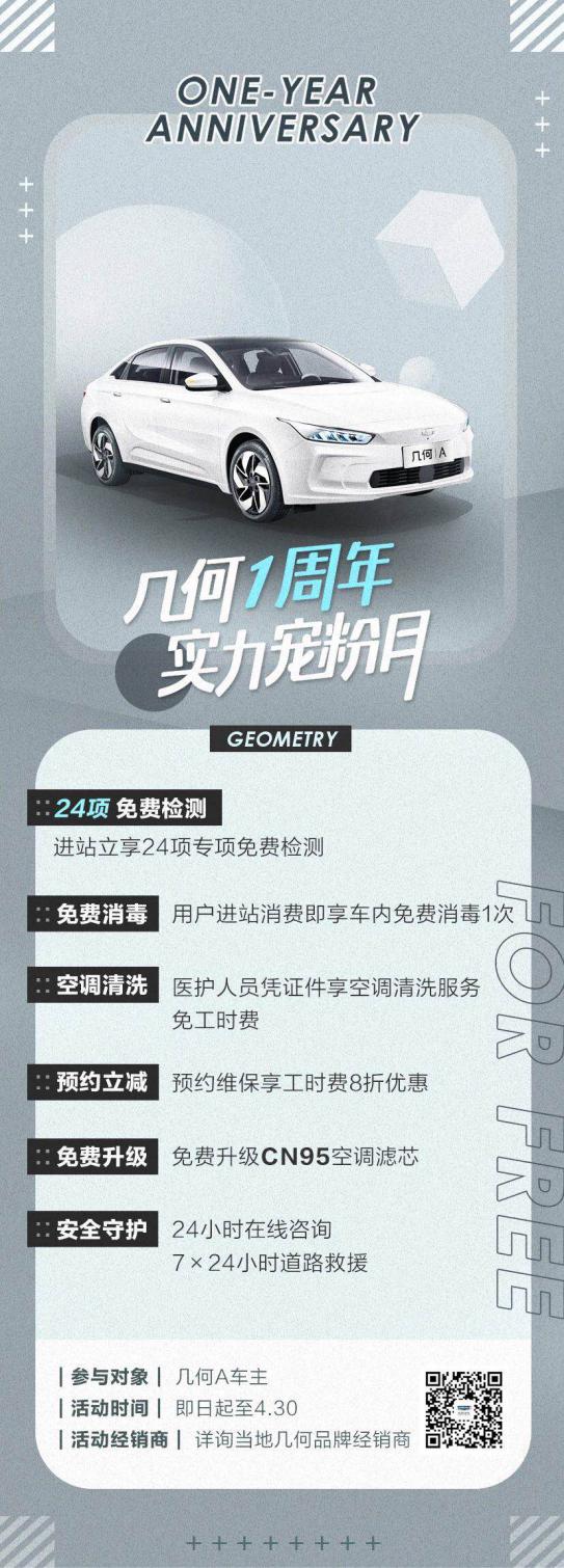总的来说,无论是续航真实力,还是智能高配置,几何A的表现都比Aion S更突出、更圈粉。所以,如果你手握15-20万元预算想买台纯电车,那几何A无疑是你更明智的选择!另外,为回馈广大用户的支持和信赖,几何A上市一周年,开启实力宠粉月,给车主们实在的福利——即日起到4月30日,几何A车主进站立享“24项免费检测”、“免费升级 CN95空调滤芯”、“免费基础消毒一次”等众多福利;同时,几何A还特别面向北京地区推出“几何周年庆,京喜抢先购”活动,购车可享“3000抵30000、至高10万元2年免息贷款补贴”等优惠;而北京外的全国其他地区用户也同样可享“1000抵10000、至高8000元金融贴息或至高8000元置换补贴”等周年庆福利,心动的话就赶紧行动吧!