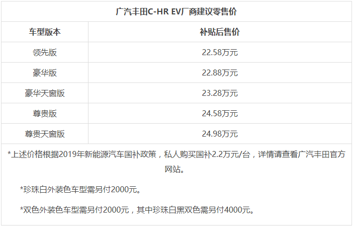 (2020年4月22日,广州)C区玩家抢先触“电”,基于丰田电动化技术和丰田QDR而开发的高品质纯电SUV——广汽丰田C-HR EV正式登场,新车提供五大配置版本、八种可选车色,全系列产品厂商联系零售价22.58万-24.98万元,即日起全面发售。