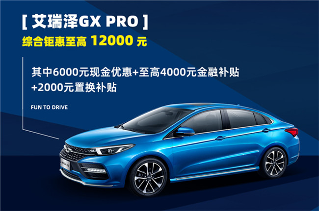 奇瑞汽车4月仍延续推出“免息减压、安心返岗,5亿红包大派送”感恩回馈活动,凡选购艾瑞泽GX冠军版、艾瑞泽GX PRO、艾瑞泽5 PRO在内的奇瑞全系车型,可享受高额优惠。艾瑞泽GX PRO综合钜惠12000元,包括6000元现金优惠+至高4000元金融补贴+2000元置换补贴。