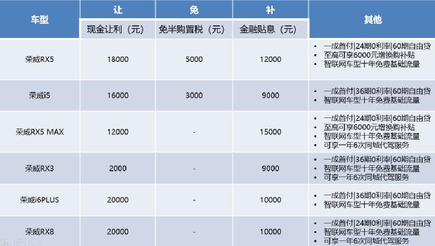 即日起,用户购买荣威全系燃油车型(荣威RX5、荣威i5、荣威RX5 MAX、荣威RX3、荣威RX8、荣威i6 PLUS),可享“让、免、补”三重钜惠补贴。以荣威RX5为例,现在购买可享18000元现金让利、5000元免半购置税和12000元金融贴息,以及最高6000元的增换购补贴,综合优惠价值高达41000元。