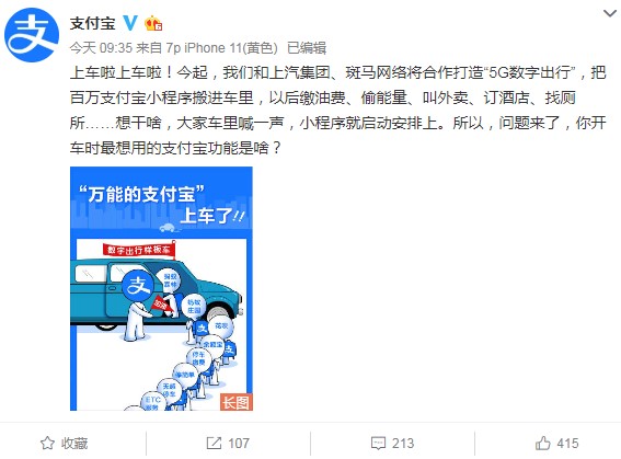 4月24日,支付宝官宣联手上汽集团、斑马网络共同打造5G数字出行样板车,百万支付宝小程序首次实现上车。用户坐在车里动动嘴,上至交通出行影音娱乐,下到休闲购物理财养生,各类服务统统安排。