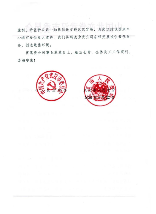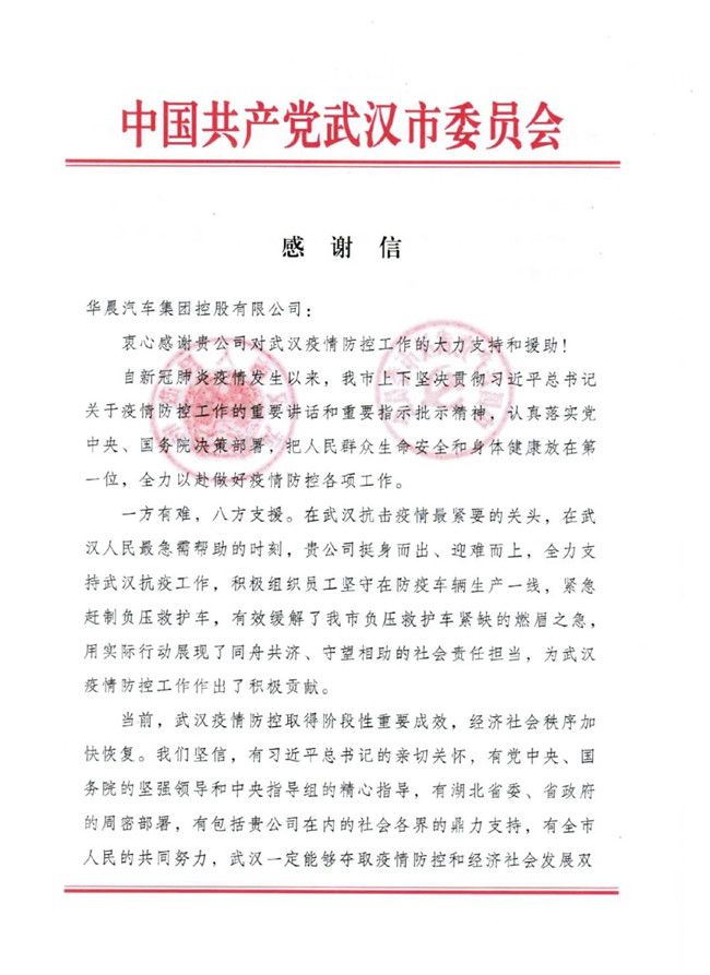 4月22日,武汉市委、市政府向华晨集团发来感谢信,感谢华晨集团在疫情期间为武汉抗击疫情做出的贡献。