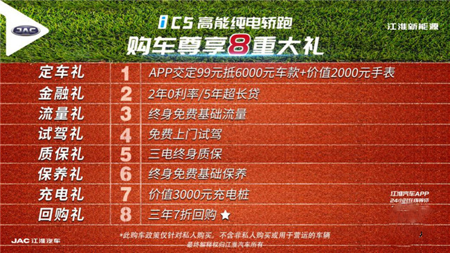 为了感恩和回馈广大用户对江淮iC5的支持与信赖,江淮新能源特为此次购买iC5的i粉提供以下尊享权益: