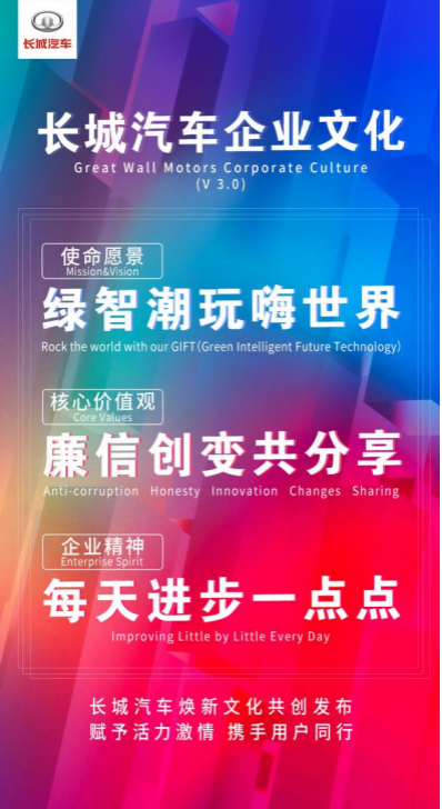 此外,为打造一个更开放、更高效、更有吸引力的发展平台,长城汽车还推行内部称谓“去总化”,并发布全新企业文化“绿智潮玩嗨世界 廉信创变共分享 每天进步一点点”,由此构建了更为和谐奋进的工作氛围,进一步激发企业上下的使命感、责任感及成就感。