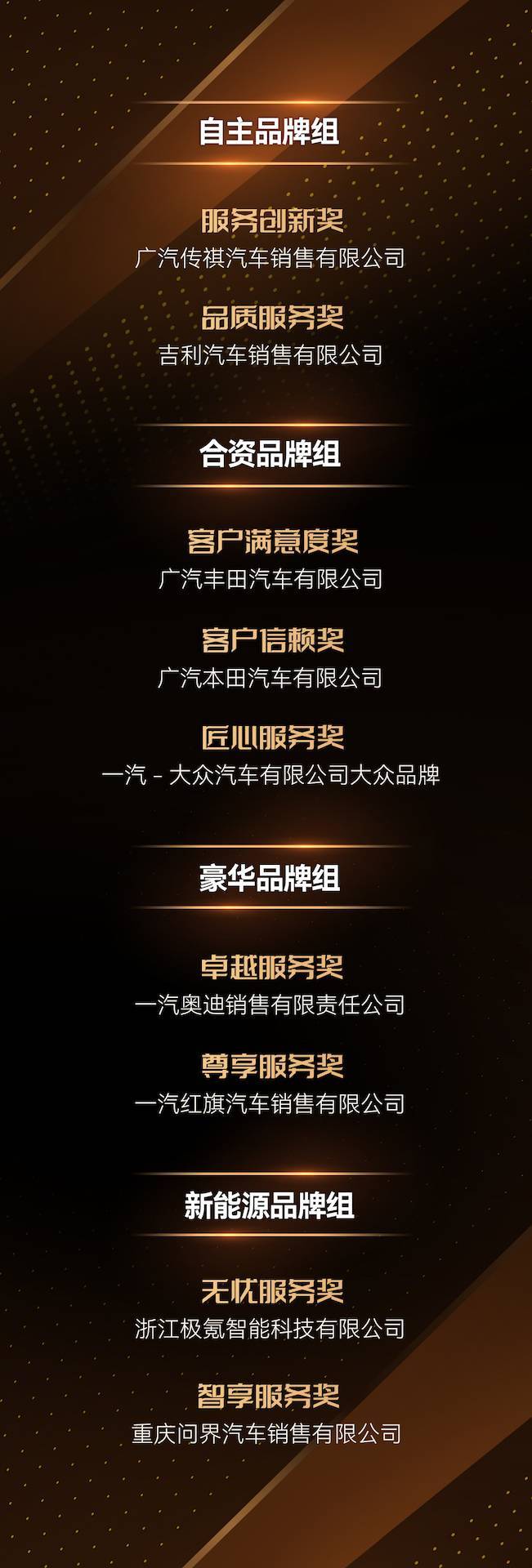 2025(第二十届)中国汽车金扳手奖评选共设置4个组别,分别为自主品牌、合资品牌、豪华品牌、新能源品牌,依据评选标准及评审结果,最终广汽传祺、吉利汽车荣获自主品牌组年度奖项,广汽丰田、广汽本田、一汽-大众大众品牌荣获合资品牌组年度奖项,一汽奥迪、一汽红旗荣获豪华品牌组年度奖项,极氪、问界荣获新能源品牌组年度奖项。