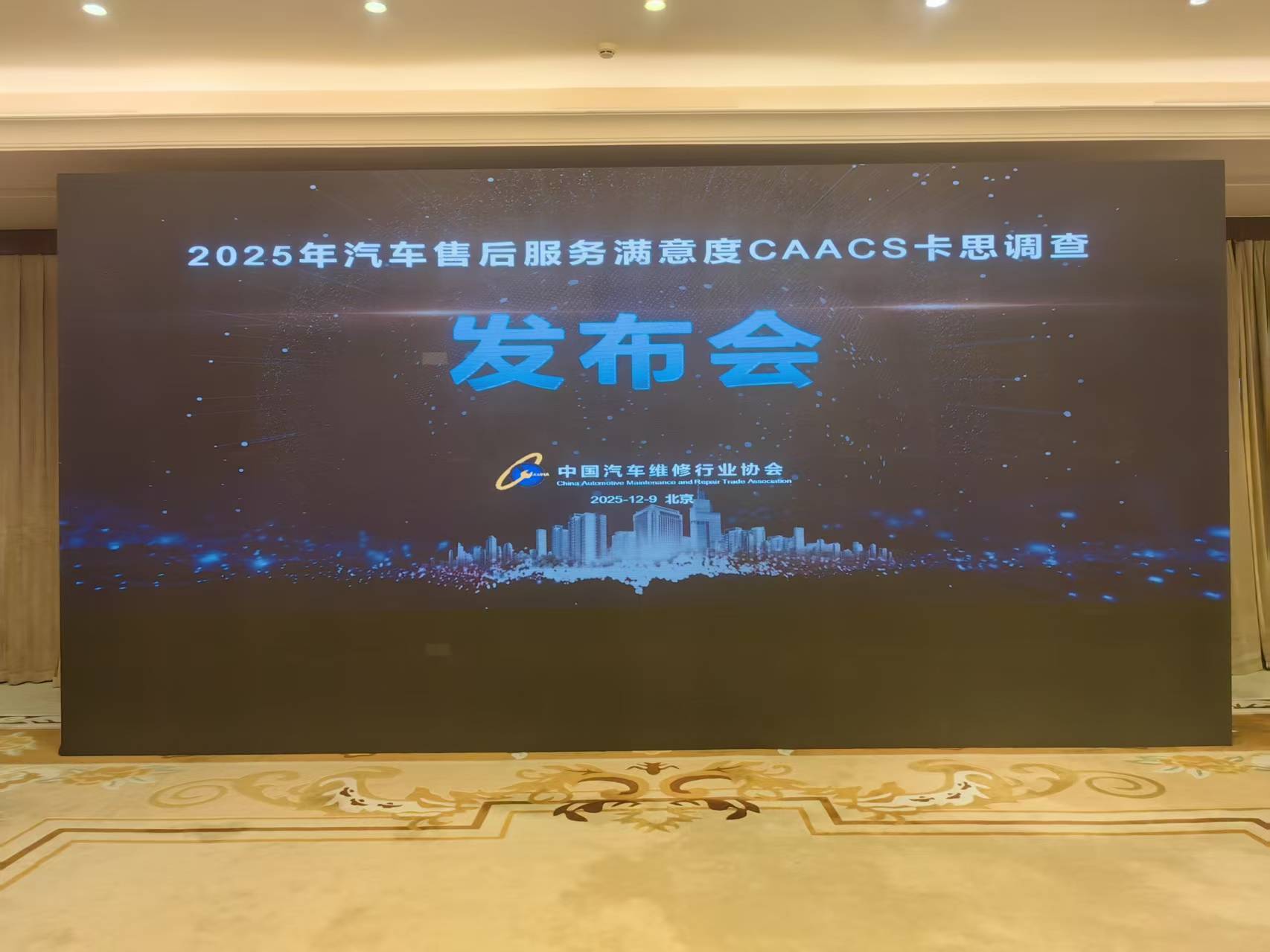 2025年12月9日上午,由中国汽车维修行业协会主办的2025年汽车售后服务客户满意度调查(CAACS卡思调查)发布会在北京国家会议中心成功举行。中国汽车维修行业协会副会长兼汽车制造企业售后服务分会会长盖方、秘书长底彦彬、副秘书长康学楠、行业发展部主任赵军、汽车制造企业售后服务分会秘书长蔡永升出席发布会。各乘用车和商用车主机厂售后服务负责人、行业专家及媒体代表齐聚一堂,共同见证调查成果发布。
