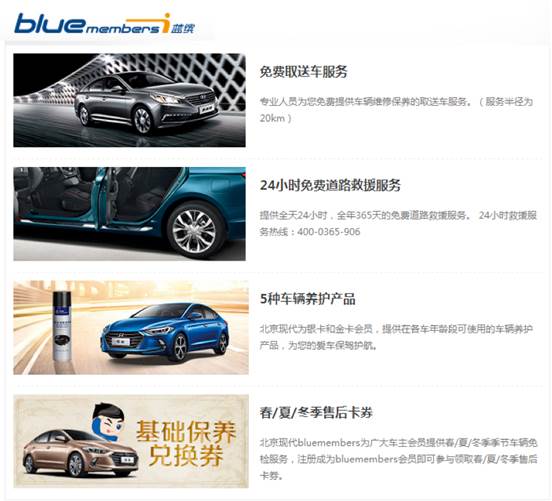 针对服务,早在2015年,北京现代便推出了Blue Members蓝缤会员服务品牌,通过会员权益、车辆服务、生活服务三大领域,为用户带来尊崇感。在近两年的时间里,用户基于Blue Members服务平台获取了更多超出用车之外的服务体验,逐渐在用户间形成良好口碑,推动更多用户加入蓝缤计划。