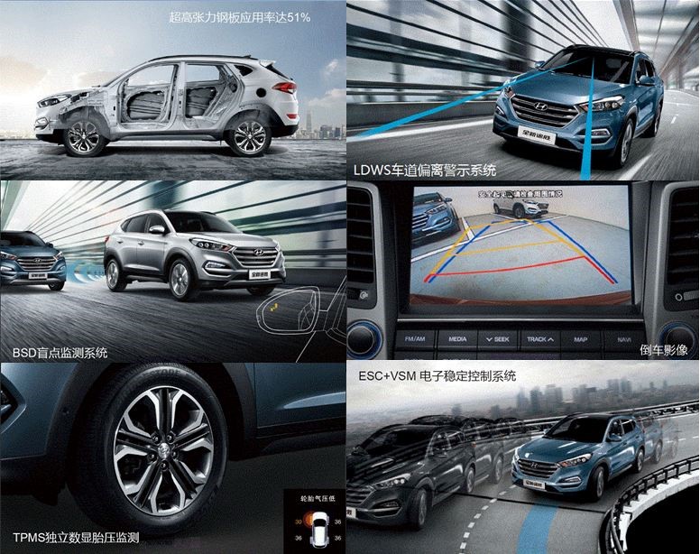 安全性能同样是全新途胜的强项。在被动安全方面,高达到51%的高刚性钢板使用率,和优化设计的车身结构一起,将全新途胜的车身骨架刚度较上一代车型提升了30%,再加上气囊、侧气帘以及预紧式安全带共同保护,为高安全性打牢了基础;在主动安全方面,BSD盲区监测、LDWS车道偏离警示、TPMS胎压监测、倒车影像等先进智能的安全装备像贴身保镖一样时刻警觉周围可能存在的危险,而HAC+DBC上下坡辅助系统和ESC+VSM电子稳定控制系统则像教练一样,帮助驾驶者轻松化解各种险情。